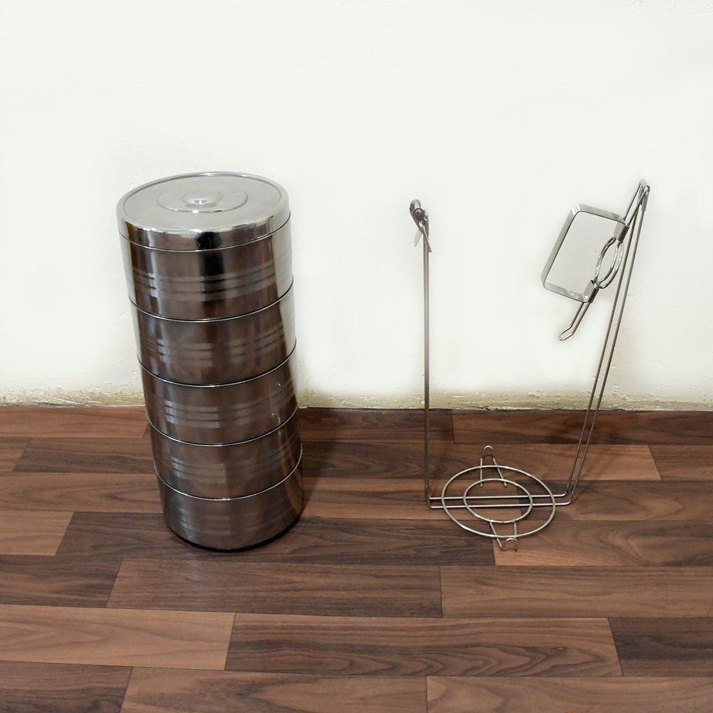 5 Compartment Lunch Box (Stainless Steel): Round Tiffin, Leakproof (16x5")